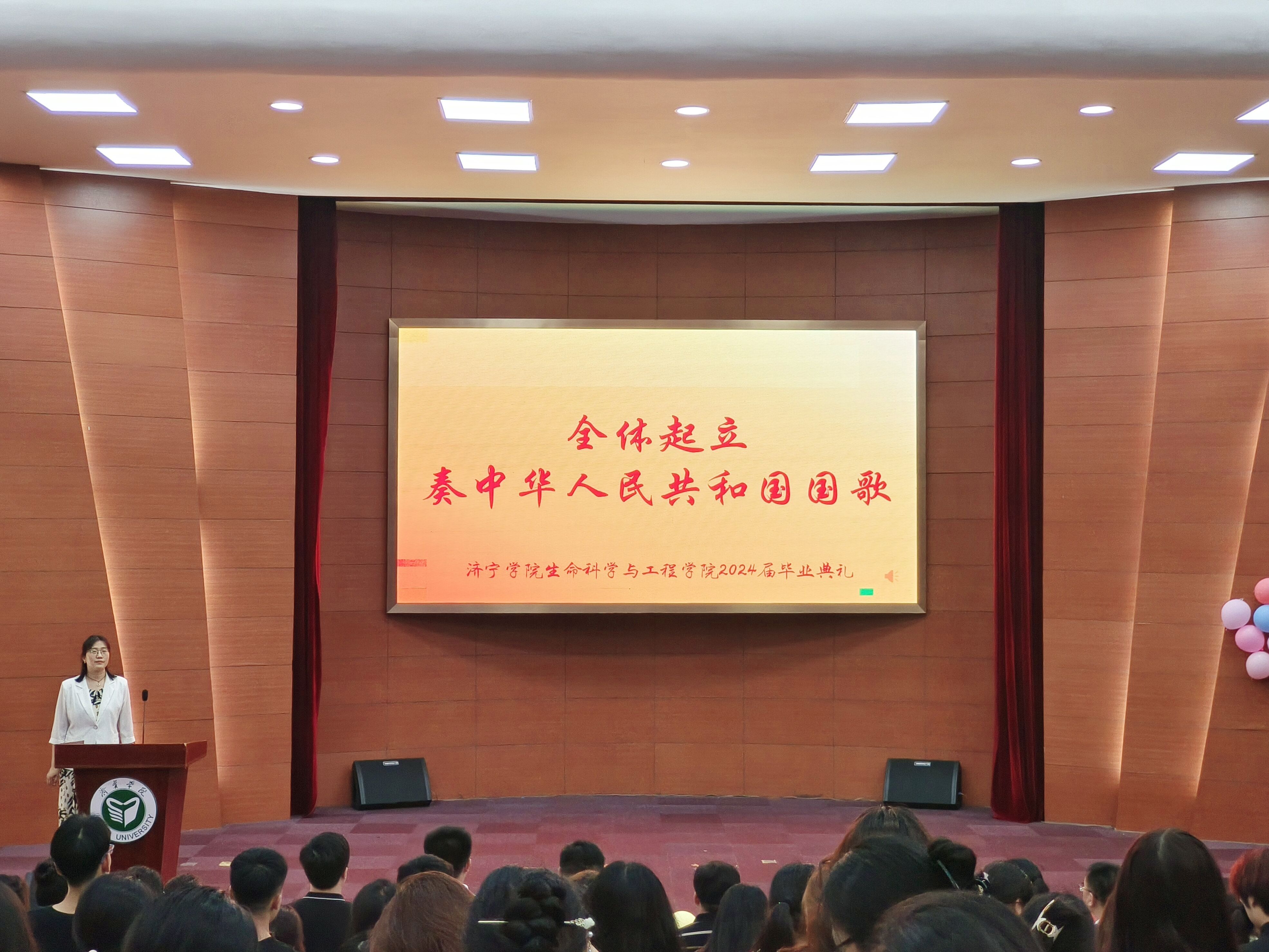 毕业典礼在雄壮的国歌声中拉开帷幕,全体师生起立高唱国歌。