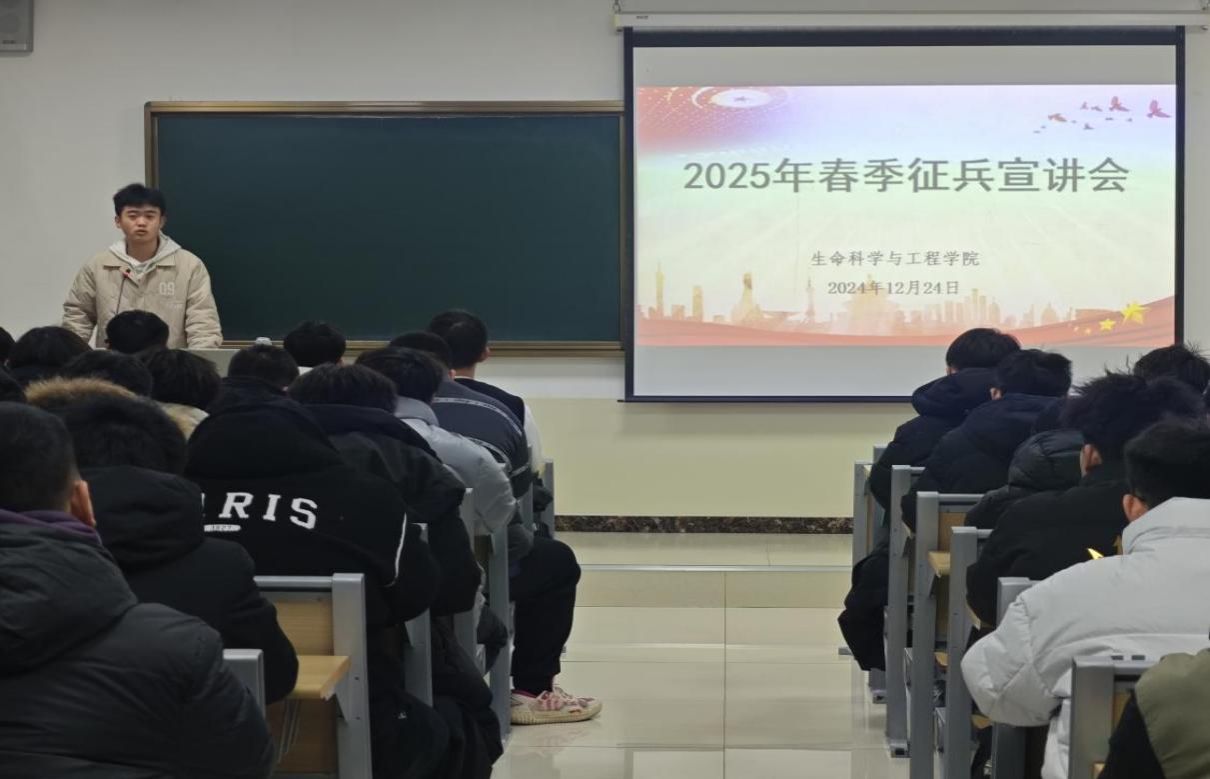 12月24日,我院在9号楼A405教室举办2025年春季征兵宣讲会。宣讲会邀请退役士兵代表刘林、张海潮作宣讲,由辅导员马泽瀛主持,2025届毕业生及有参军入伍意向的非毕业班学生代表参加。