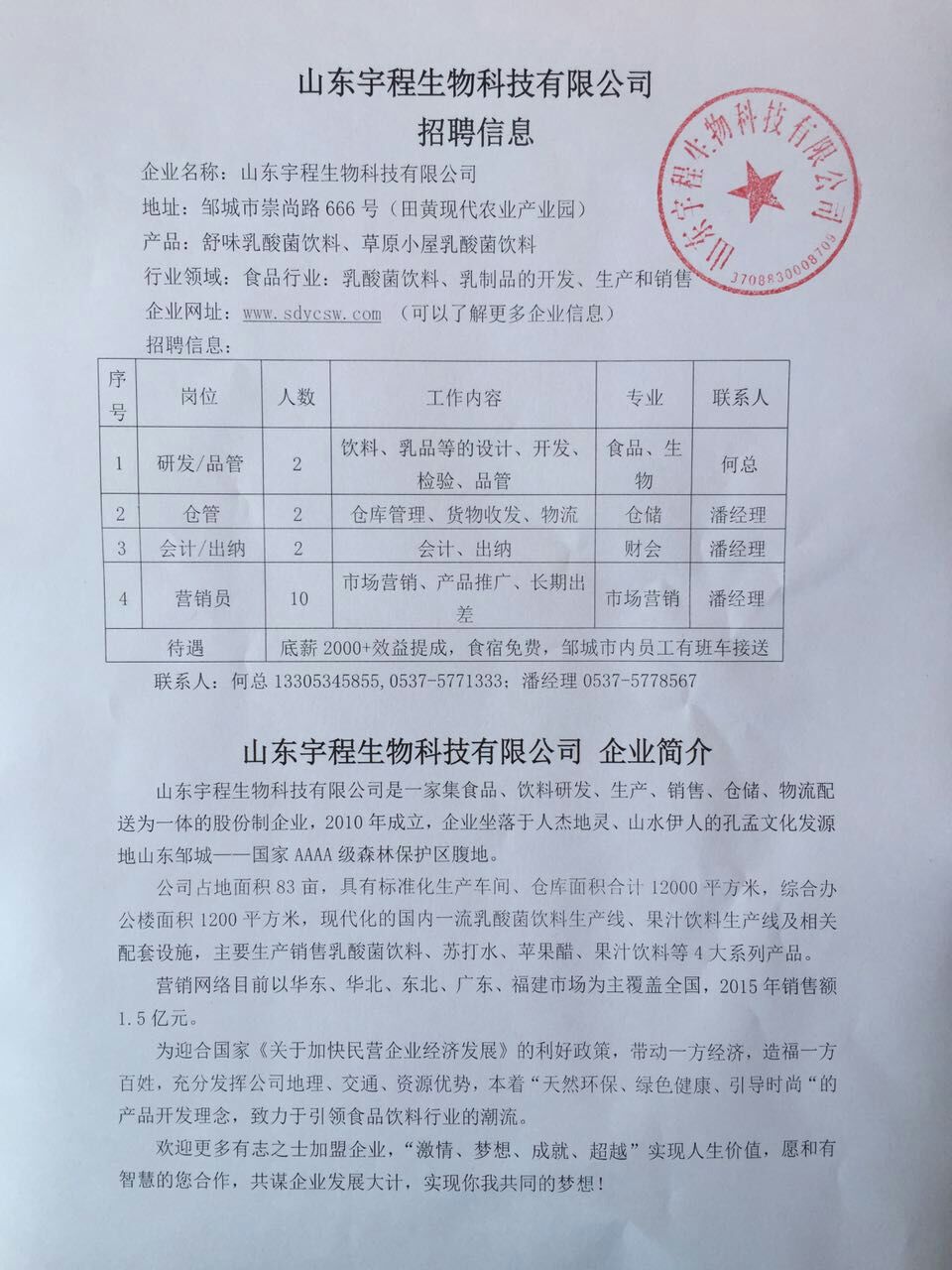 山东宇程生物科技有限公司招聘信息
