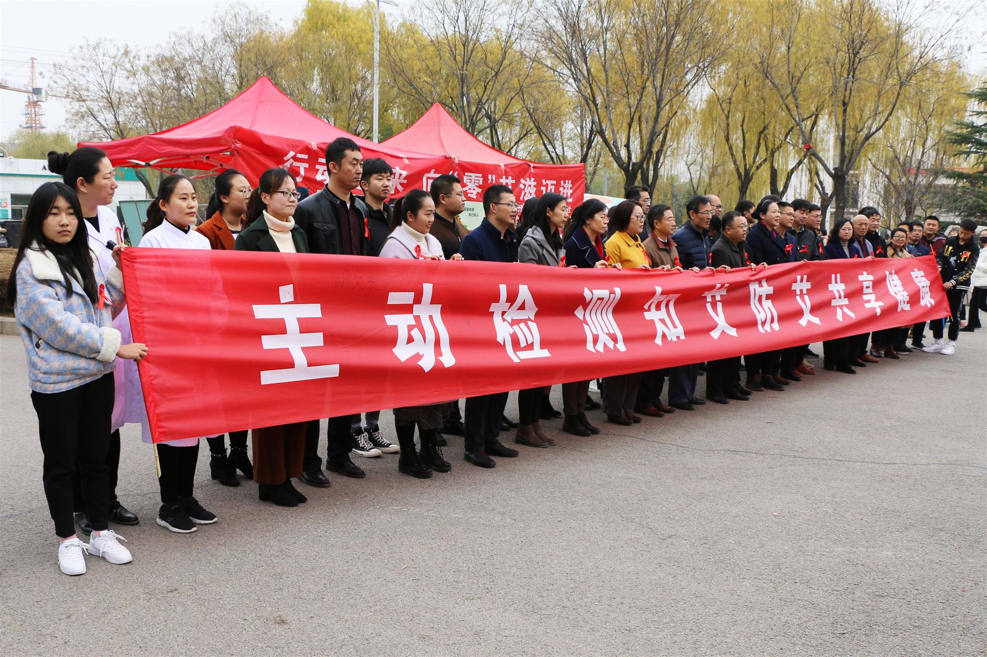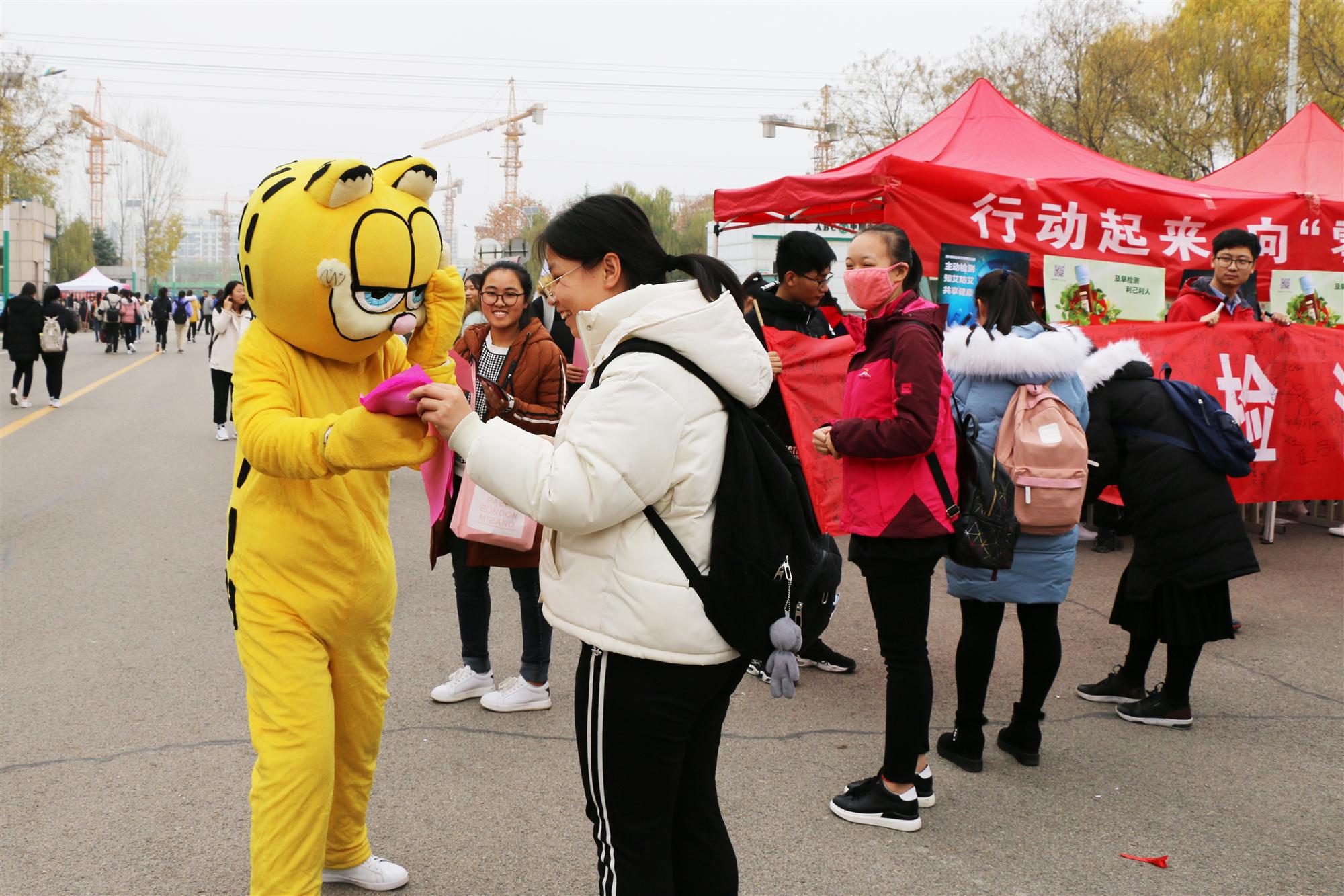 活动伊始,参与活动的每个人都佩戴上了红绸带,现场全体师生在印有“主动检测,知艾防艾,共享健康”横幅上进行了签字仪式,为艾滋病的防控表达了坚定的决心。与之同时工作人员还发放了艾滋病防控相关的宣传资料,积极地向同学们宣传了艾滋病如何传播、如何预防等有关知识;此外,宣传点附近由各系制作的展板上,也详细的介绍着艾滋病病毒潜伏期、艾滋病发病期等知识,这有效地增强同学们对预防艾滋病知识的了解。