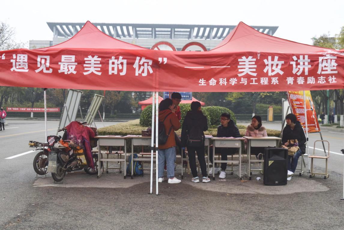 为丰富大学生校园生活,提高大学生的美妆护肤意识及能力。生命科学与工程系青春励志社于11月15日在学校北门开展以“遇见最美的你”为主题的美妆讲座宣传活动。