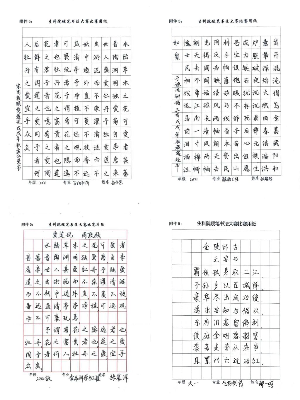 大赛对参赛作品逐一评选,评选出一二三等奖和优秀奖若干。其中,2021级酿酒工程班张超超书写的《拒礼诗》等5份作品获得一等奖,2023食品科学与工程(中外合作办学)2班郭航书写的《书端州郡齐壁》等10份作品获得二等奖,2023级生物工程2班施宣如书写的《咏煤炭》等15份作品获得三等奖,23食品科学与工程(专升本)2班彭娟书写的《芙蓉楼送辛渐》等20份作品获得优秀奖。