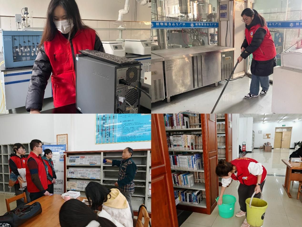 志愿者们走进图书馆与实验室开展志愿服务活动,为师生提供良好的教学环境。志愿者们在图书馆图书室,对书架上的图书进行分类整理、对图书室桌椅进行擦拭、对地面进行打扫;在实验楼楼道以及实验室,开展卫生死角清扫工作。