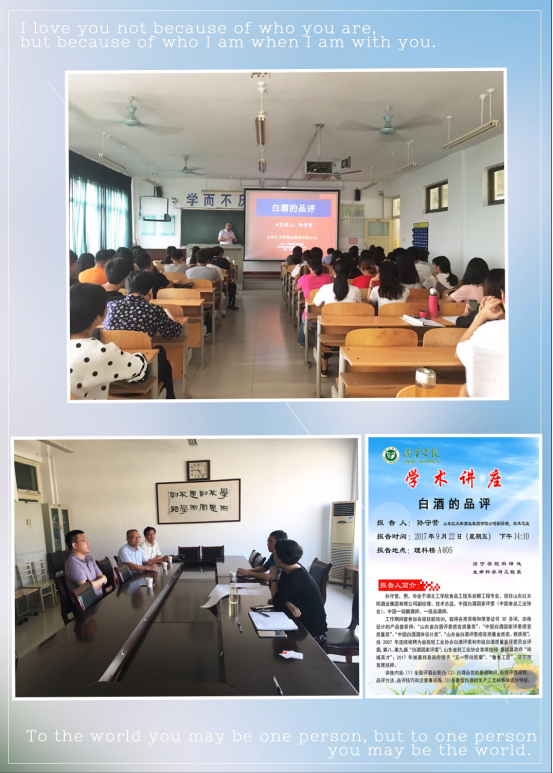 2017年9月22日(星期五)下午,应生命科学与工程系邀请,山东红太阳集团技术总监、中国白酒国家评委、中国一级酿酒师、一级品酒师孙守营作了题为“白酒的品评”讲座。科研处赵洁处长、生命科学与工程系主任尹春光教授与100多名师生听取了讲座。